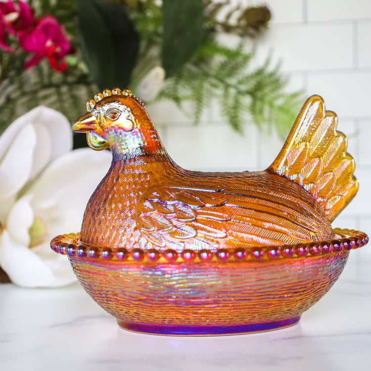 A client favorite, this hen on a nest is a beautiful amber/pink carnival glass! She will make a stunning Spring candle for sure!