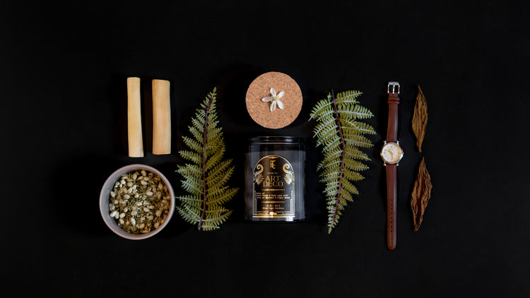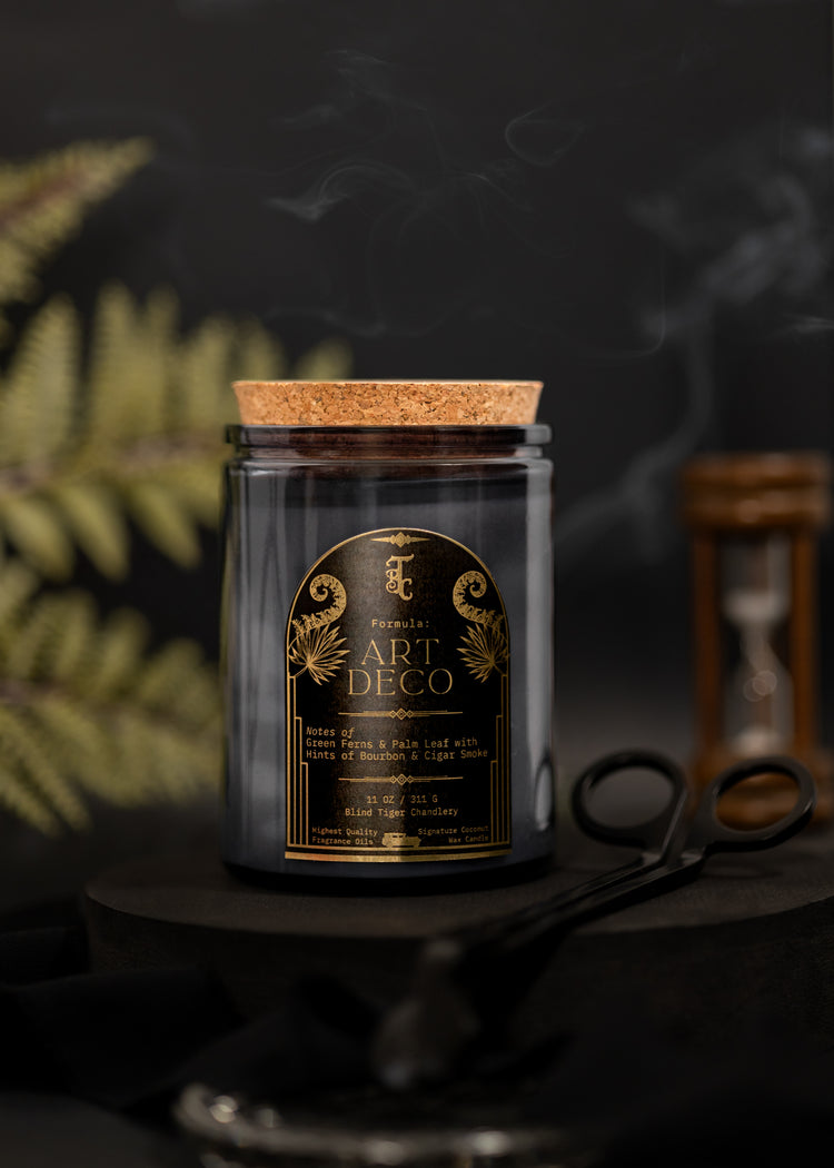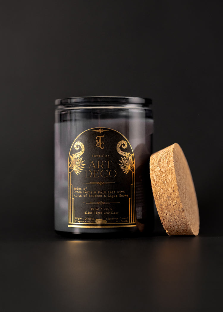 Part of our spring 2025 collection, Art Deco makes its debut with fresh and green notes of Ferns and Palm Leaf with base notes of Bourbon and Cigar Smoke.