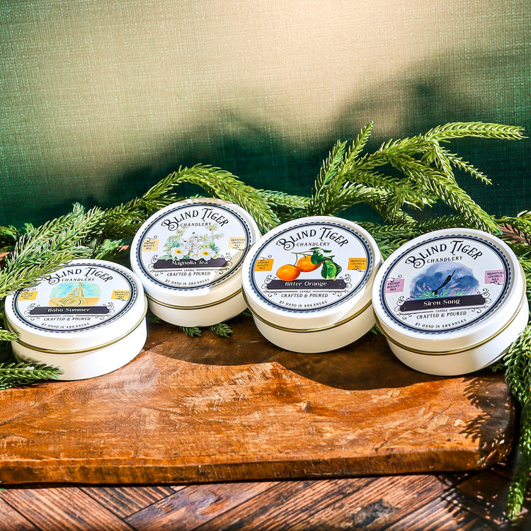 Our top four best sellers available for the first time as a bundle of four, single-wick 3.5 ounce candle tins. The perfect bundle for all the stockings on your mantle!